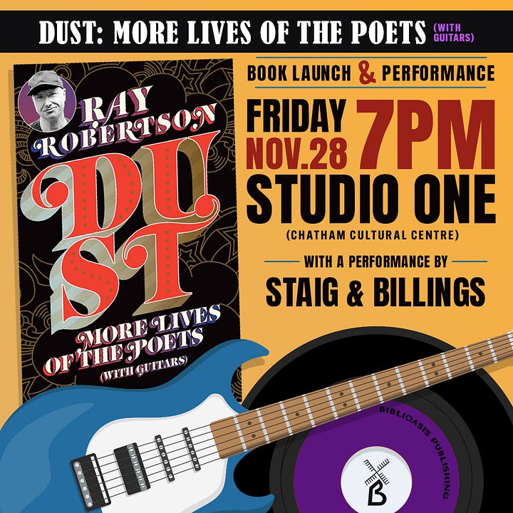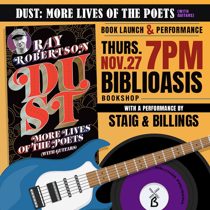 Ray Robertson has two events lined up next week. Accompanying him on the road is folk duo Staig & Billings, who will be covering one song by each of the twelve musicians profiled in Dust. It’s sure to be a good time.